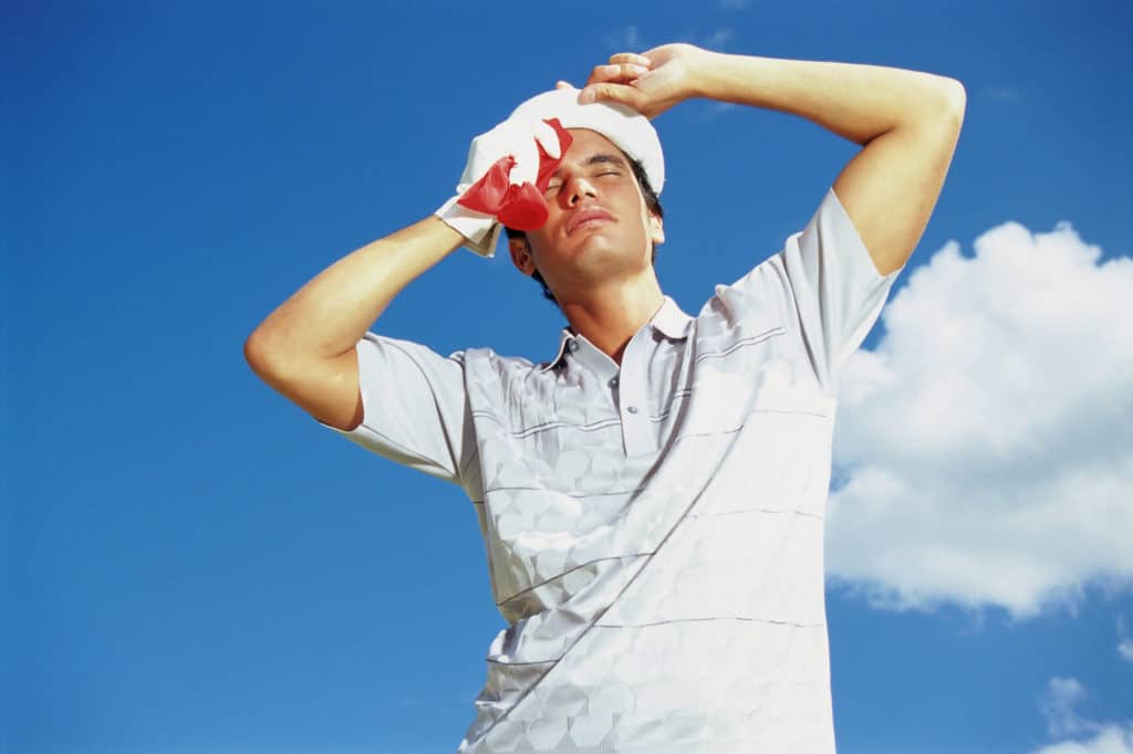 Making sure you have plenty of water with you and using a wet towel to keep yourself cool are two ways to prevent heat exhaustion on the golf course.
